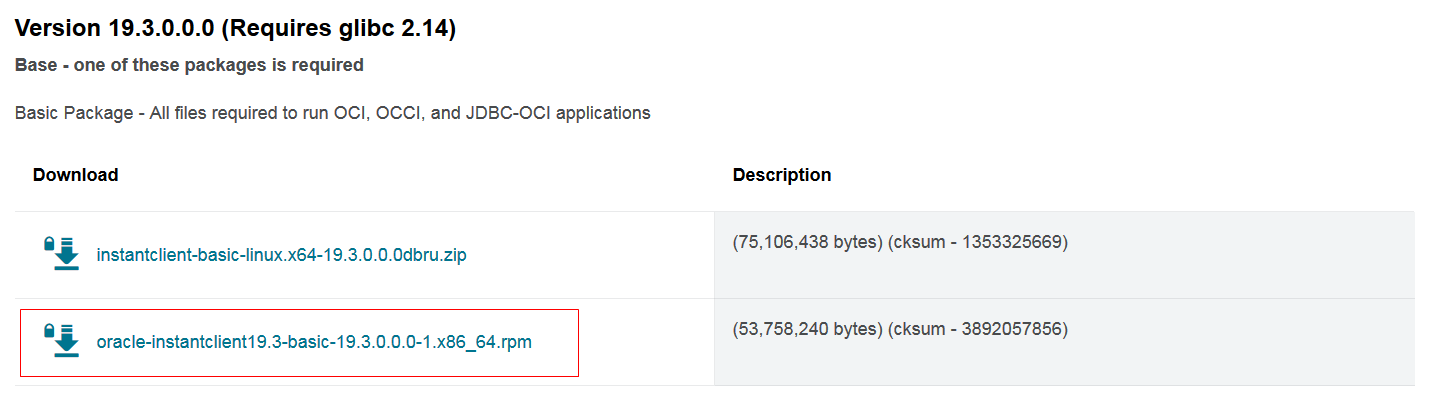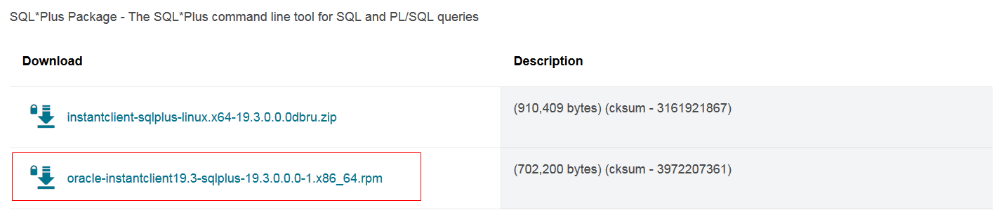 | yum install -y oracle-instantclient19.3-basic-19.3.0.0.0-1.x86_64.rpm yum install -y oracle-instantclient19.3-sqlplus-19.3.0.0.0-1.x86_64.rpm |