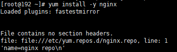 | Loaded plugins: fastestmirror File contains no section headers. file: file:///etc/yum.repos.d/nginx.repo, line: 1 'name=nginx repo\n' |