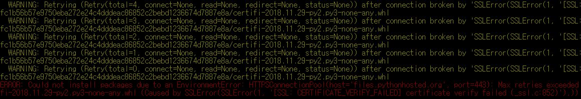 [--trusted-host pypi.python.org --trusted-host files.pythonhosted.org --trusted-host pypi.org] 옵션을 사용하여 패키지 도메인들을 신뢰하는 방법입니다.